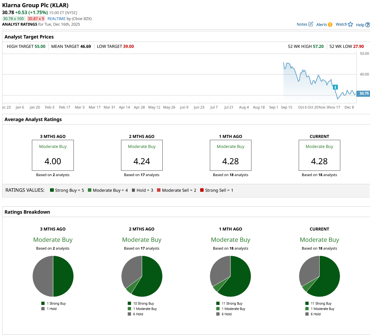 Out of the 18 analysts covering Klarna stock, 11 recommend “Strong Buy,” one recommends “Moderate Buy,” and six recommend “Hold.” The average KLAR stock price target is $47, above the current price of $31.