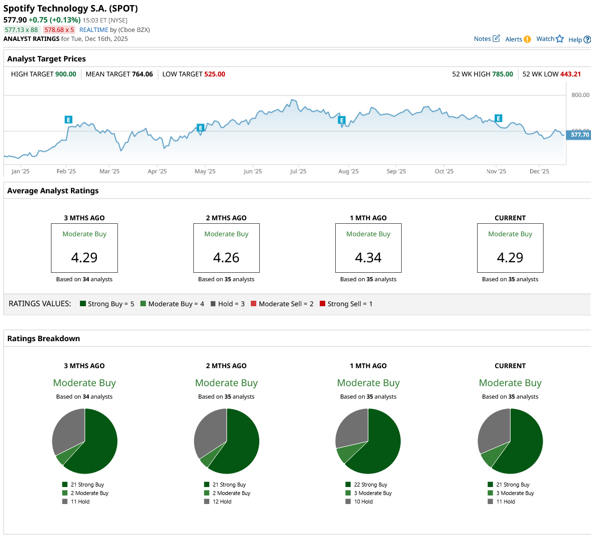 Out of the 35 analysts covering SPOT stock, 21 recommend “Strong Buy,” three recommend “Moderate Buy,” and 11 recommend “Hold.” The average SPOT stock price target is $764, above the current price of $578.