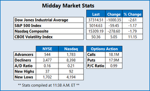 Stocks are plunging midday, as Wall Street paces for a third-straight daily loss amid escalating global trade tensions.